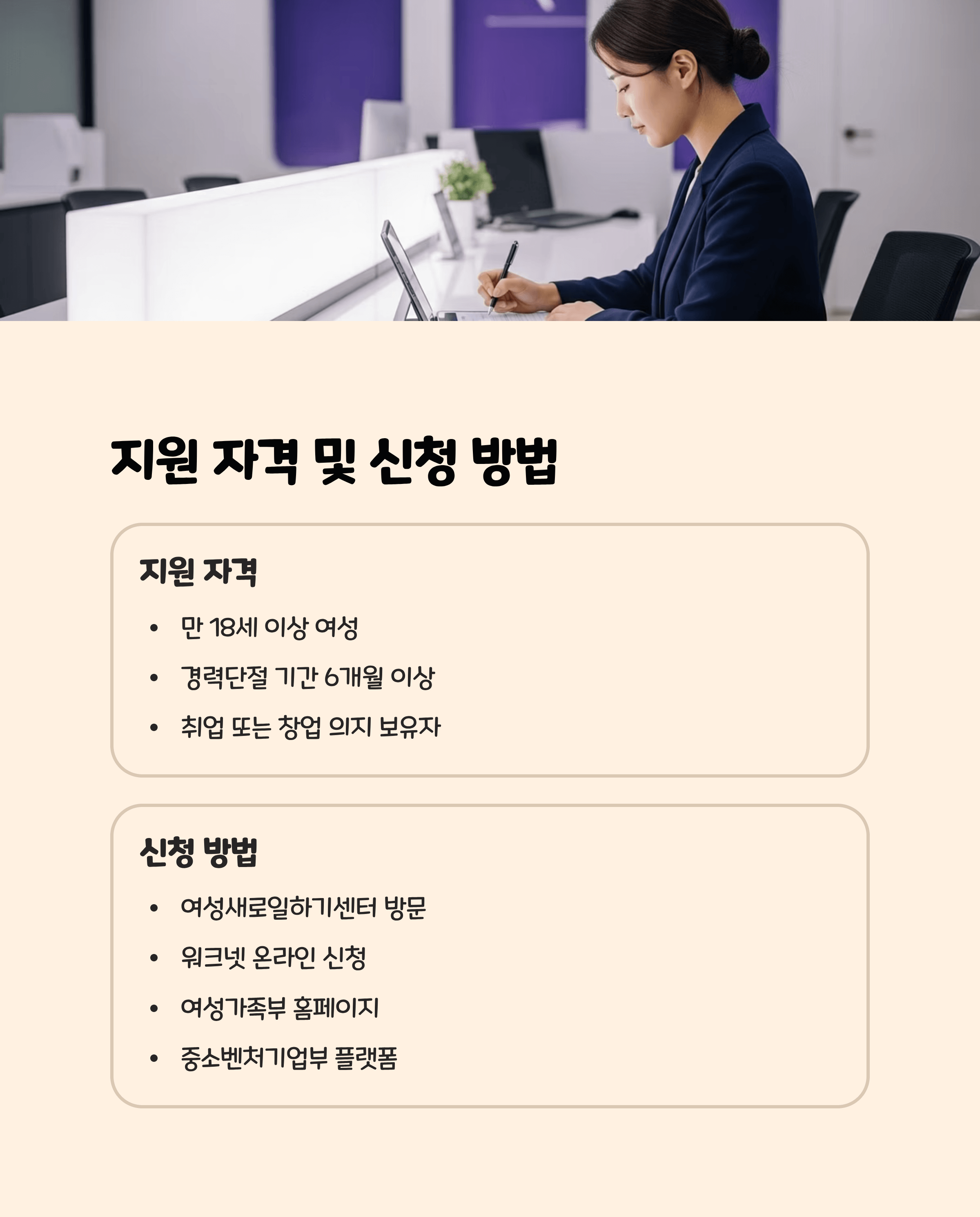 - 신청 경로: 여성새일센터, 워크넷, 중소벤처기업부, 여성가족부 홈페이지 등