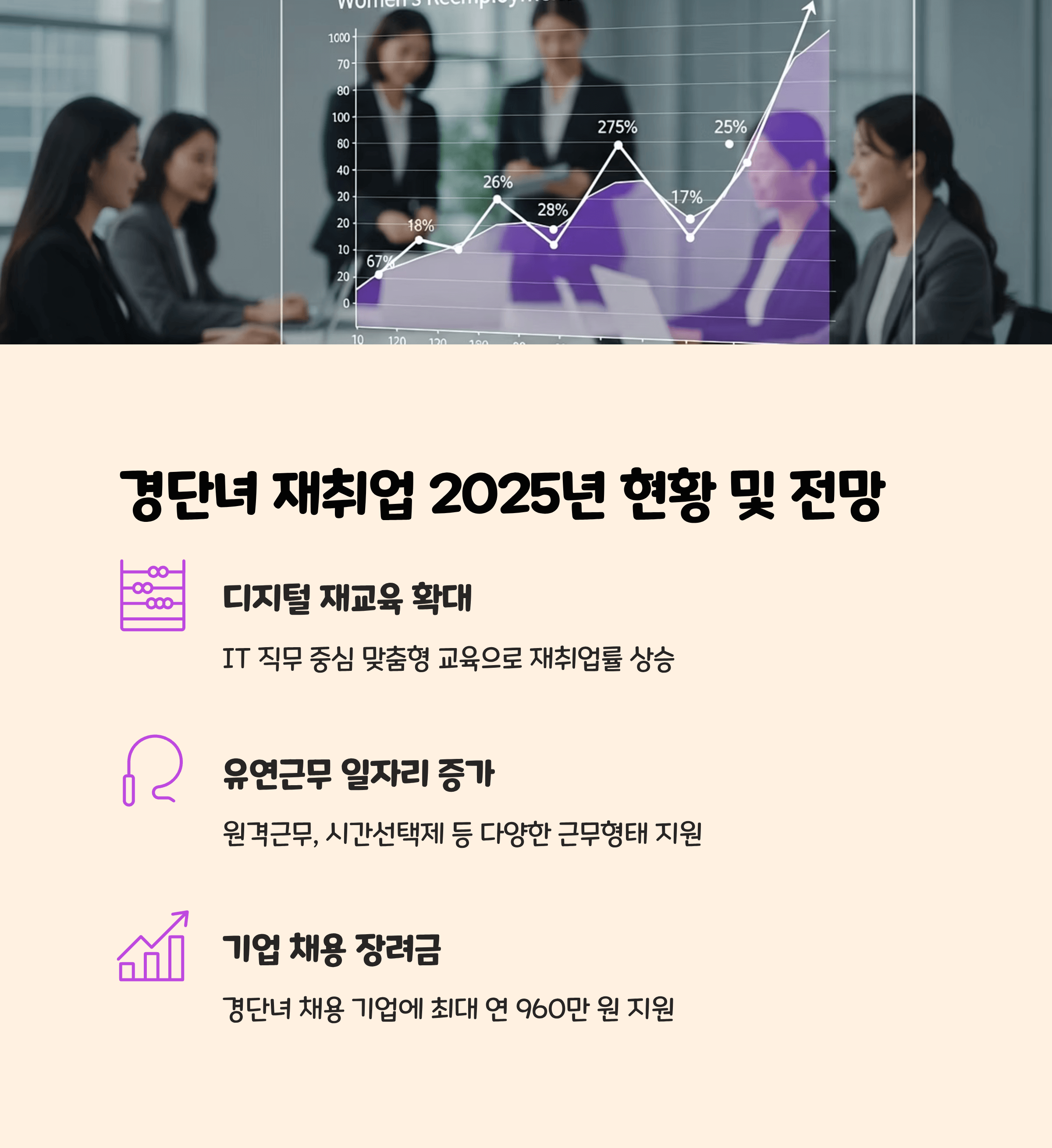 디지털 직무 재교육과 유연근무 확대 정책 덕분에, 2025년 경단녀 취업률은 전년 대비 상승할 것으로 보입니다.