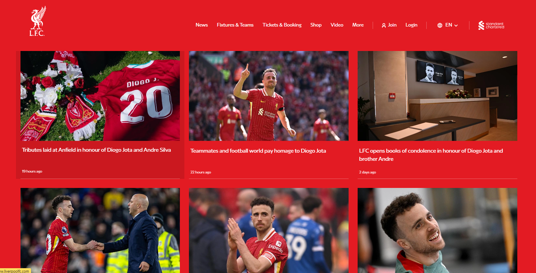 리버풀 팬들은 조타의 유니폼과 플래카드를 통해 안필드에서 헌화하고 있습니다.