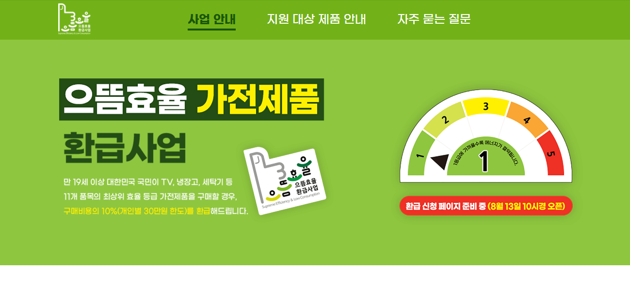으뜸효율 가전제품 환급 사이트는 8월 13일 10시 부터 신청 접수 페이지가 오픈됩니다.