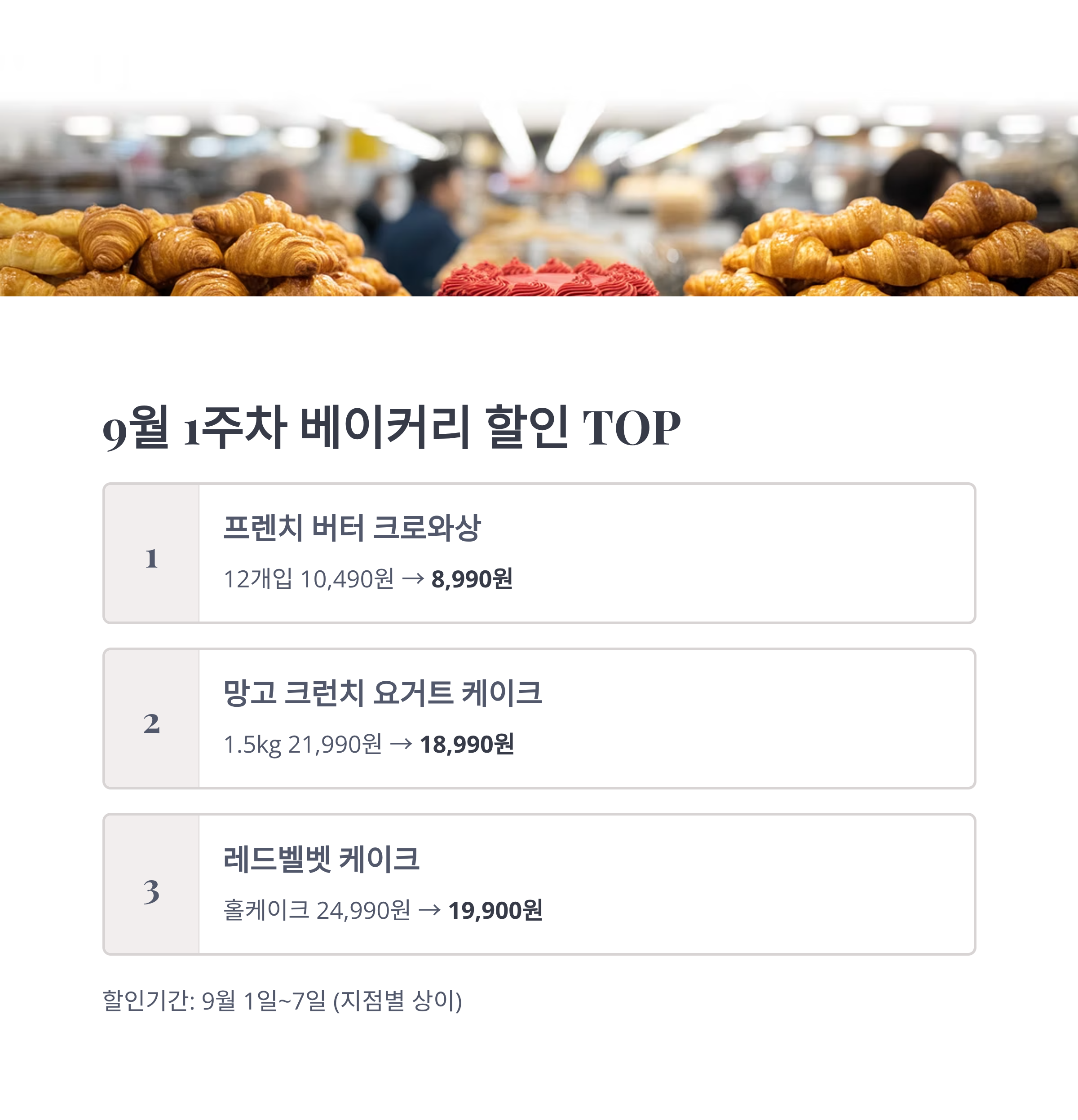 - 🎉 신상 디저트(망고 크런치 케이크·단팥빵)는 9월 한정 특가