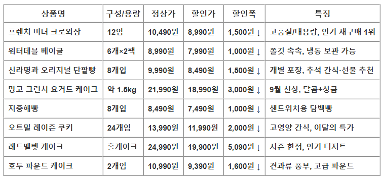 🥐 인기 빵부터 케이크, 신상 디저트까지 대용량·시즌 한정·신제품 할인 품목이 쏟아지고 있어요.