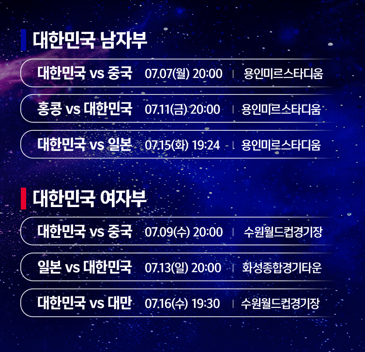 | 남자부 | 7월 7일(월) | 한국 vs 중국 | 용인 미르스타디움 | 20:00 |
